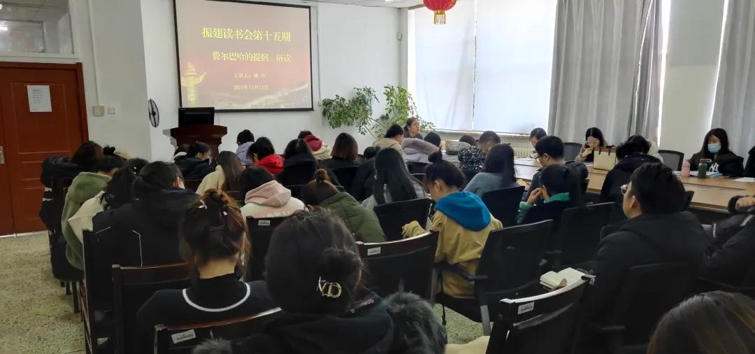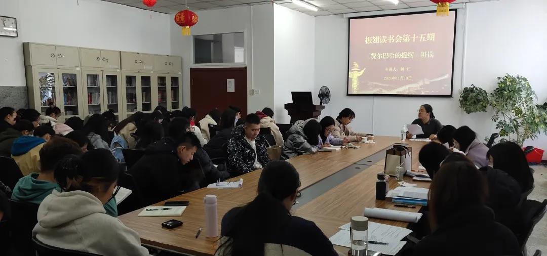 本网讯(通讯员 刘冰婕)2021年11月13日9:30,公司第十五期“振翅”读书会如期举行,读书会由公司姚红老师主持、主讲,全体2021级研究生参与了此次活动。本期活动以《关于费尔巴哈的提纲》经典著作为研读内容。《关于费尔巴哈的提纲》是马克思在1845年写的笔记,恩格斯称它为“包含着新世界观的天才萌芽的第一个文件”。习近平强调:共产党人要把读马克思主义经典、悟马克思主义原理当作一种生活习惯和精神追求。