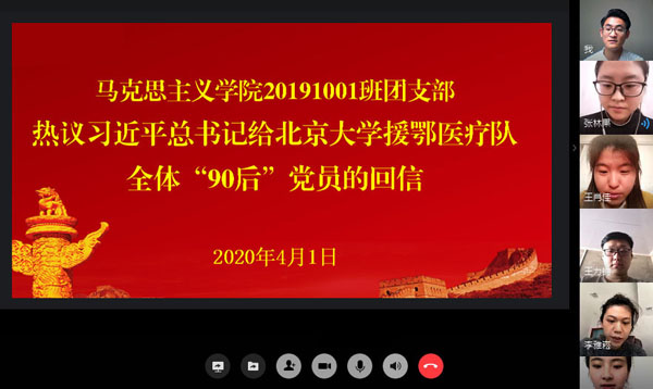 研究生党支部、各班级团支部积极开展了学习习近平总书记给北大援鄂医疗队全体“90后”党员回信精神线上分享活动。全体研究生党员和员工干部们一致认为,要牢记习近平总书记嘱托,以这次抗疫中“90后”的优秀代表为榜样,志存高远、忠于祖国,敢于担当、勇于奋斗,勤奋学习、锤炼身心,努力成为在新时代改革开放事业中可堪大用、能担重任的栋梁之才,让青春在党和人民最需要的地方绽放绚丽之花。