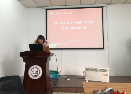 12月13日上午9点,在公司资料室研究生助理耿雅楠代表本次参加实践学习活动的同学们为2018级研究生作了实训工作的思想汇报。她向在座的各位同学们介绍了参观全国爱国主义教育示范基地——二战盟军高级战俘营、车立方党群指导服务中心——一汽集团、长春汽车高专产学研辽源综合实训基地、全国精神文明村、吉林省农村干部培训基地、朝阳实训基地等情况并分享了实践学习活动的收获与心得。