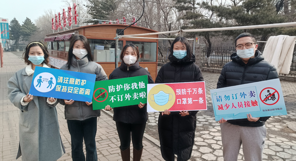 此外,在教学楼、食堂、寝室楼前,随处都能看到手举“预防千万条,口罩第一条”“请勿订外卖,减少人员接触”提示板的志愿者身影。