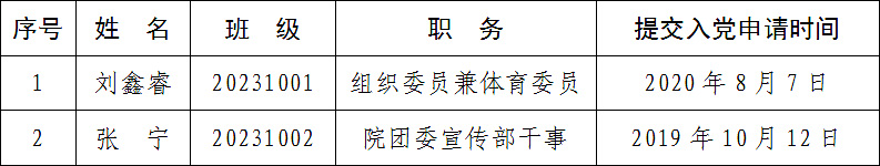 按照发展党员工作有关规定,根据党员推荐和群团组织推优情况,经研究生支部委员会研究,并报公司党委备案,确定刘鑫睿、张宁2名同学为入党积极分子。