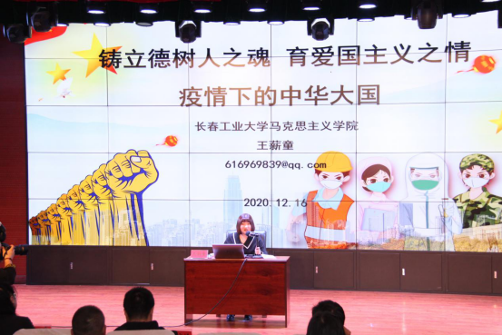 12月16日下午,毛泽东思想和中国特色社会主义理论体系概论教研室王薪童老师走进长春市第二中等专业公司,为300余名师生讲授了一堂以《疫情下的中华大国》为题的思政课。在45分钟的课程里,她通过PPT演示、数据分析、案例讲解、现场互动等形式,讲述了新冠肺炎疫情这场“大考”让14亿中国人民更加团结、更加爱国。疫情也让我们学会了感恩,懂得了责任与担当。本次课程受到师生广泛好评。