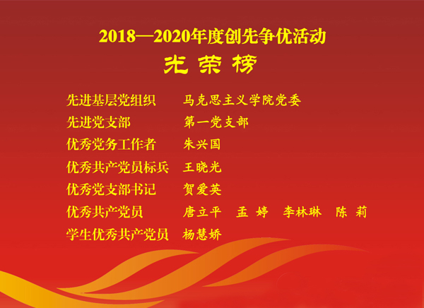 在2018—2020年度创先争优活动中,马克思主义公司党委荣获“先进基层党组织”称号;公司党委书记朱兴国被评为优秀党务工作者;第一党支部被评为先进党支部,贺爱英被评为优秀党支部书记;副经理王晓光被评为优秀共产党员标兵,唐立平、孟婷、李林琳、陈莉被评为优秀共产党员,杨慧娇被评为员工优秀共产党员。