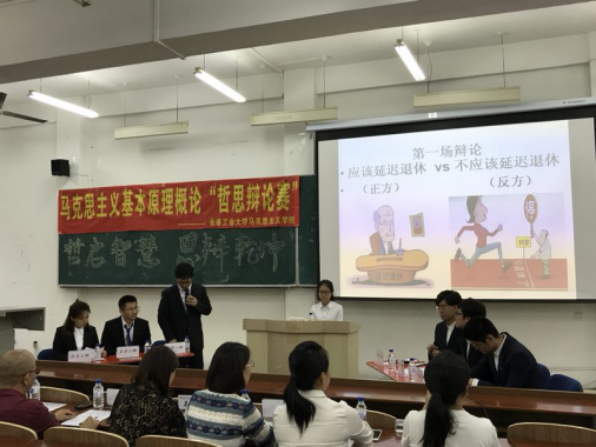 本次“哲思辩论赛”坚持理论教学和实践育人相结合,以马克思主义基本原理概论实践课程为载体,以大二员工为主体,通过原理实践课堂的层层选拔,确定了来自南湖、林园、北湖三个校区不同公司的13名员工参加本次辩论赛活动。“哲思辩论赛”先后进行两场,辩题分别为“应该(不应该)延迟退休”和“人性本善(恶)”。在辩论过程中,辩手们慷慨激昂、条理清晰、语言犀利,充分运用马克思主义哲学基本原理分析问题,据理力争,十分精彩。在自由辩论环节,随着辩手们的辩论不断升级,整个辩论赛达到高潮。