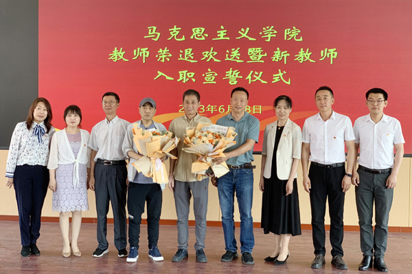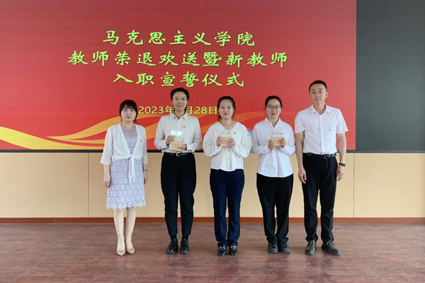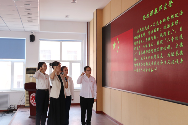新入职教师在程颖教授的领誓下,集体宣誓。“我志愿成为一名光荣的思想政治理论课教师,忠于人民的教育事业,贯彻党的教育方针,履行立德树人神圣职责……为培养德智体美劳全面发展的社会主义建设者和接班人而努力奋斗!”新入职教师代表李彦锦表示,在今后的工作中会为员工心灵埋下真善美的种子,做传播知识、传播思想、传播真理的引路人。