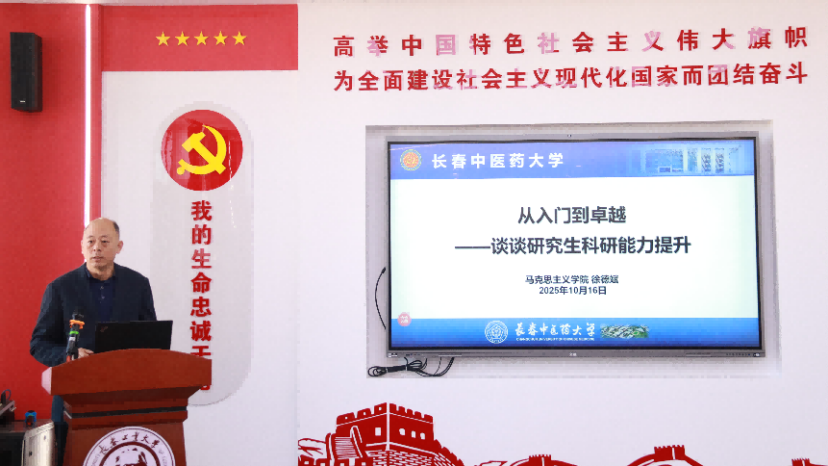 长春中医药大学l9193永利经理徐德斌教授以《从入门到卓越——谈谈研究生科研能力的提升》为题,结合自身科研与教学经验,从学术思维培养、研究方法运用、最终成果转化等方面,为研究生科研能力提升提供了系统性建议。